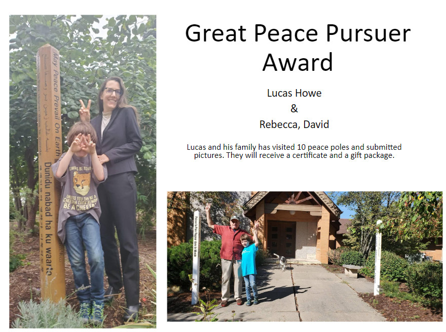 - You may be mailed a Peace Pole Pursuit certificate (for 5, 10, 15, 20 or 25 poles.)